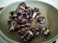 - In the same kadai, add 1/2 cup or 15 count of chopped dates with 1 tablespoon of ghee. Roast until the dates become soft and mushy. Optional: Stir in 1 teaspoon of yam powder for added texture.